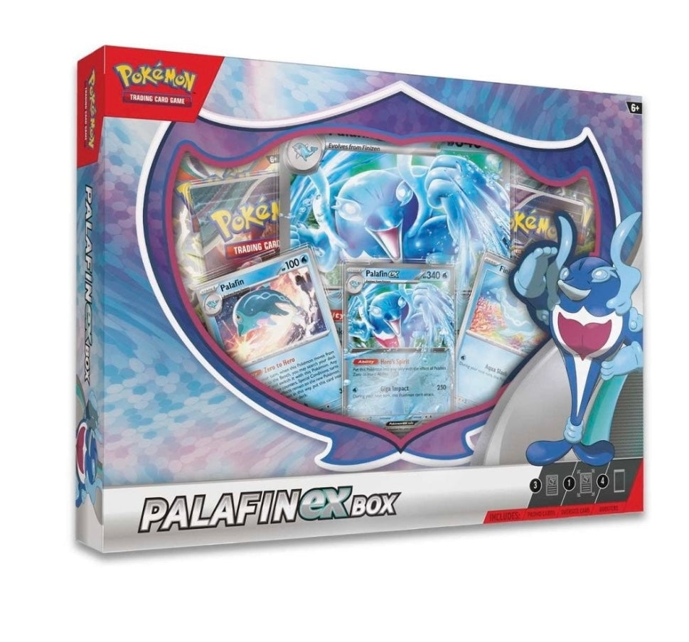 When all seems lost in battle, call on a hero to save the day! With its Zero to Hero Ability, Palafin can make a stunning transformation into the powerful Palafin ex, ready to pummel opponents with the might of an ocean wave. In this box, you’ll find Finizen, Palafin, and Palafin ex as playable foil cards, plus an oversize version of Palafin ex for display and a handful of booster packs with more cards inside.