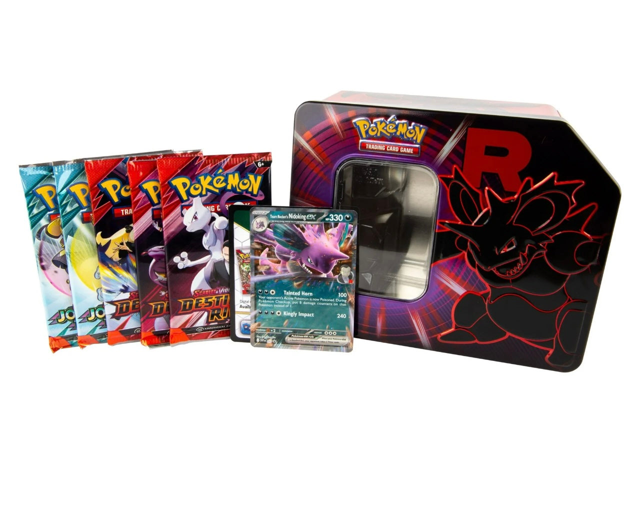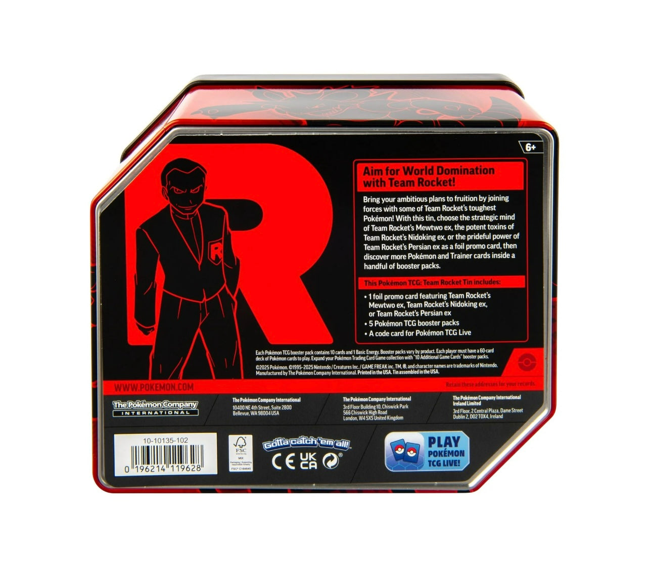 Bring your ambitious plans to fruition by joining forces with some of Team Rocket's toughest Pokemon! With this tin, choose the strategic mind of Team Rocket's Persian ex as a foil promo card, then discover more Pokemon and Trainer cards inside a handful of booster packs.